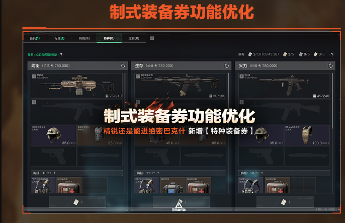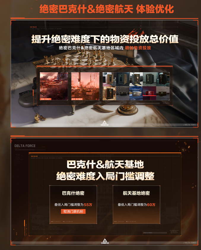 5、超多赛季优化揭晓,赛季任务全面升级、绝密巴克什&绝密航天增加物资投放、烽火地带制式装备券优化、全面战场载具操作优化等,带来更良好的游戏体验!