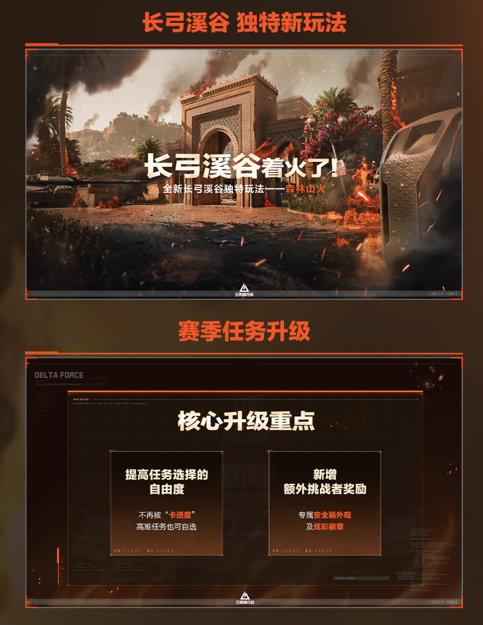 2、烽火地带新篇章,潮汐监狱新首领-典狱长、潮汐监狱新局内行动、长弓溪谷新事件-森林山火、全新侦察干员-银翼等内容,带来更热血沸腾的战场!