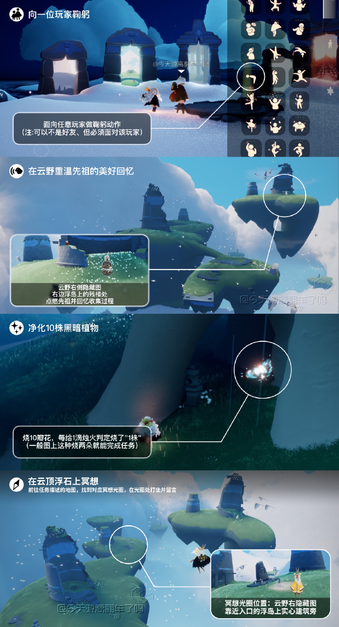 光遇今天的每日任务刷新在云野,大家知道今天9月11日的具体任务信息和做法流程吗?下面为大家带来光遇9.11每日任务怎么做的具体内容和方法,感兴趣的玩家们千万不要错过哦!