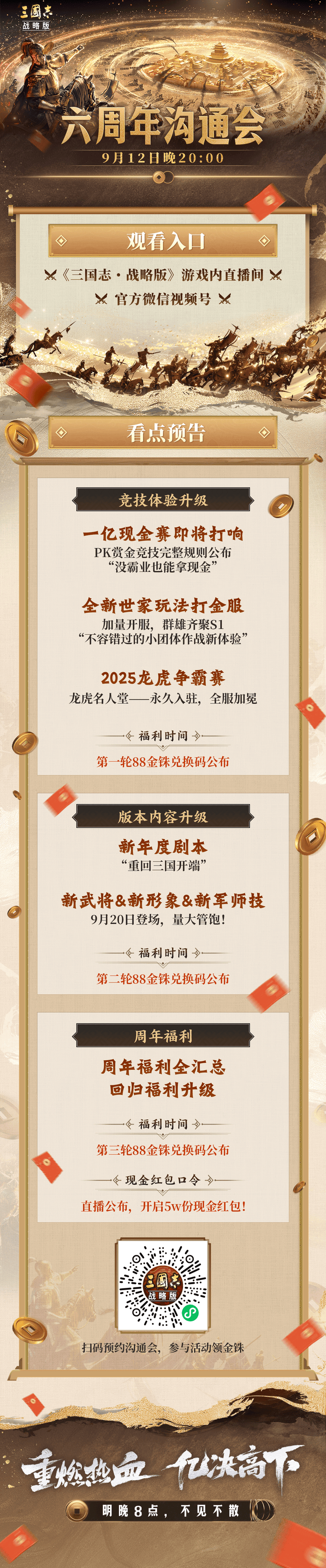 六周年沟通会将于明晚20点准时在游戏内与视频号直播!直播中还将开启3轮兑换码,每个兑换码将可获88金铢,人人有份。