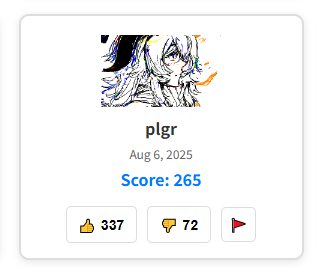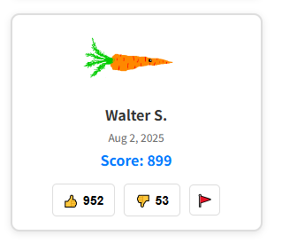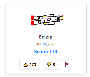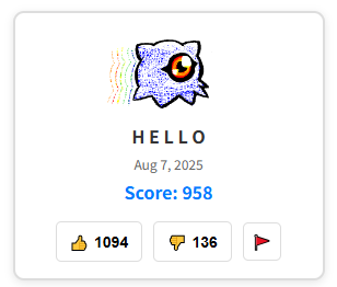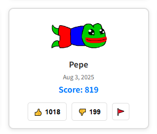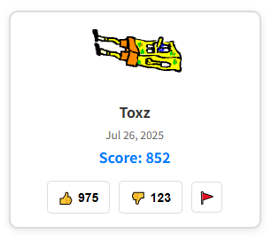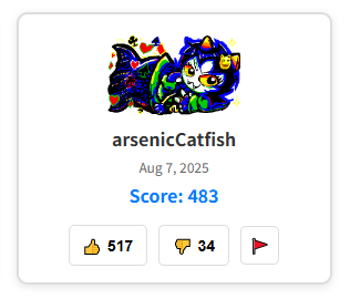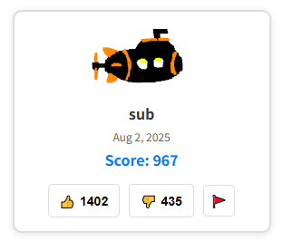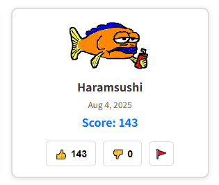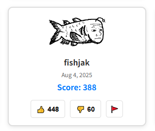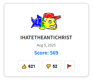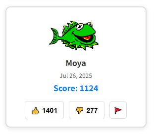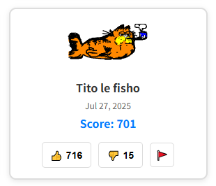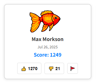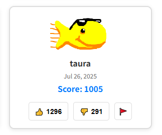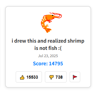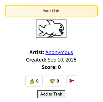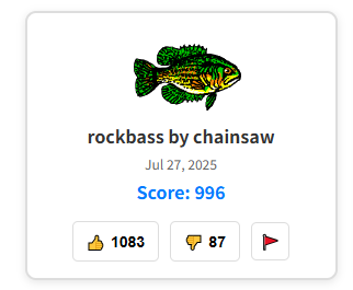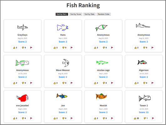 而这就涉及到了爆火的第二点原因,这里面的任何一条鱼,用户都是可以点开查看详情信息,像是创作者的ID,什么时候创作的,这些全都一目了然,更主要的是用户还可以自行给这些鱼打分,点赞加一分,点踩扣一分,针对这些评分,网站上还设置了榜单系统供全球用户欣赏,相当于变相满足了一些人的社交需求。