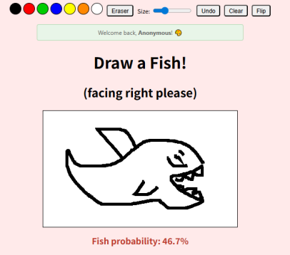 一是这网站内置的AI系统,毕竟这只是个由一个人搞出来的简陋网站,肯定不会给你用上啥特别先进的AI,这就导致它真实的判定非常迷,有的时候你感觉你画的挺有鱼样的,但系统就是不给你过。