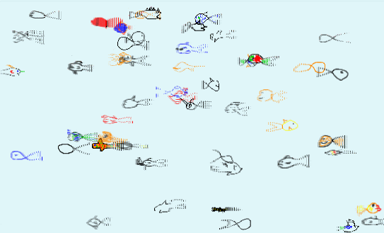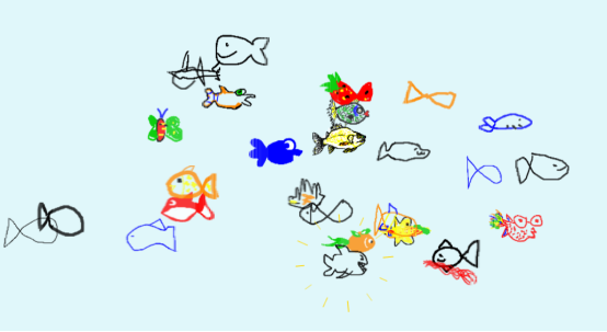 当然这个也并不是叫你随便乱画的,这个画框内部署了一个AI程序,它会判断用户画的画像是否真的符合鱼的特征,只有系统判定标准达到60%以上才能顺利投放到缸里,点开这个共享大鱼缸,你能欣赏到全世界网友们的作品,还能通过点击鼠标右键给它们投喂赛博鱼食。