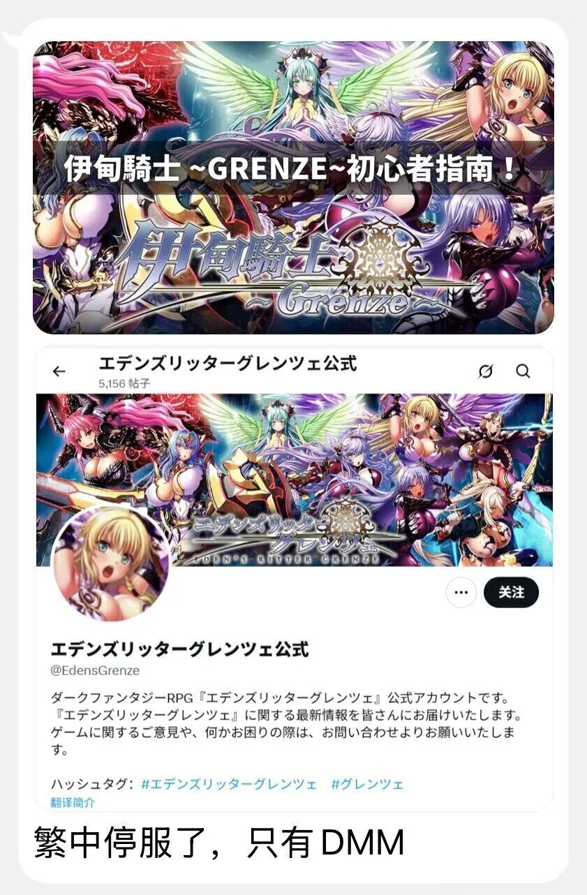 然后我就去推特看了眼,发现这游戏确实存在,名为《伊甸騎士Grenze》(又称禁忌骑士),是一款黑暗奇幻题材的手机rpg游戏。我翻了翻内容,发现就画风来说,那张五星出货图,确实是出自这个游戏。