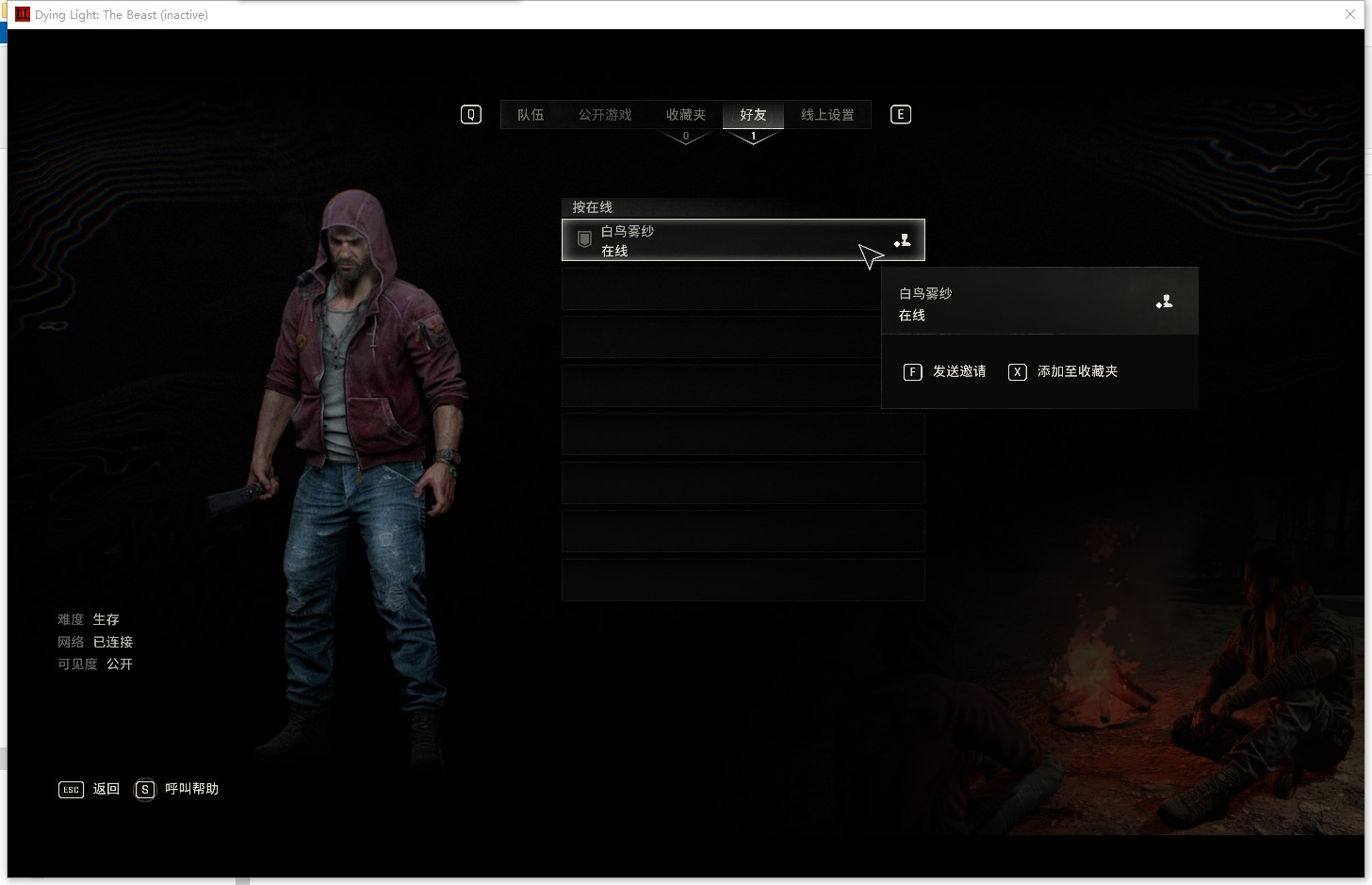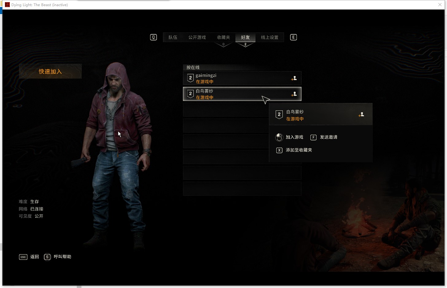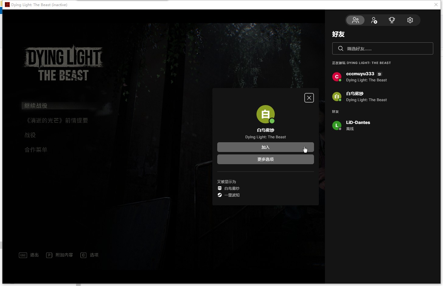 联机:游戏中按ESC打开合作选项——好友列表,邀请好友或者进好友的游戏。