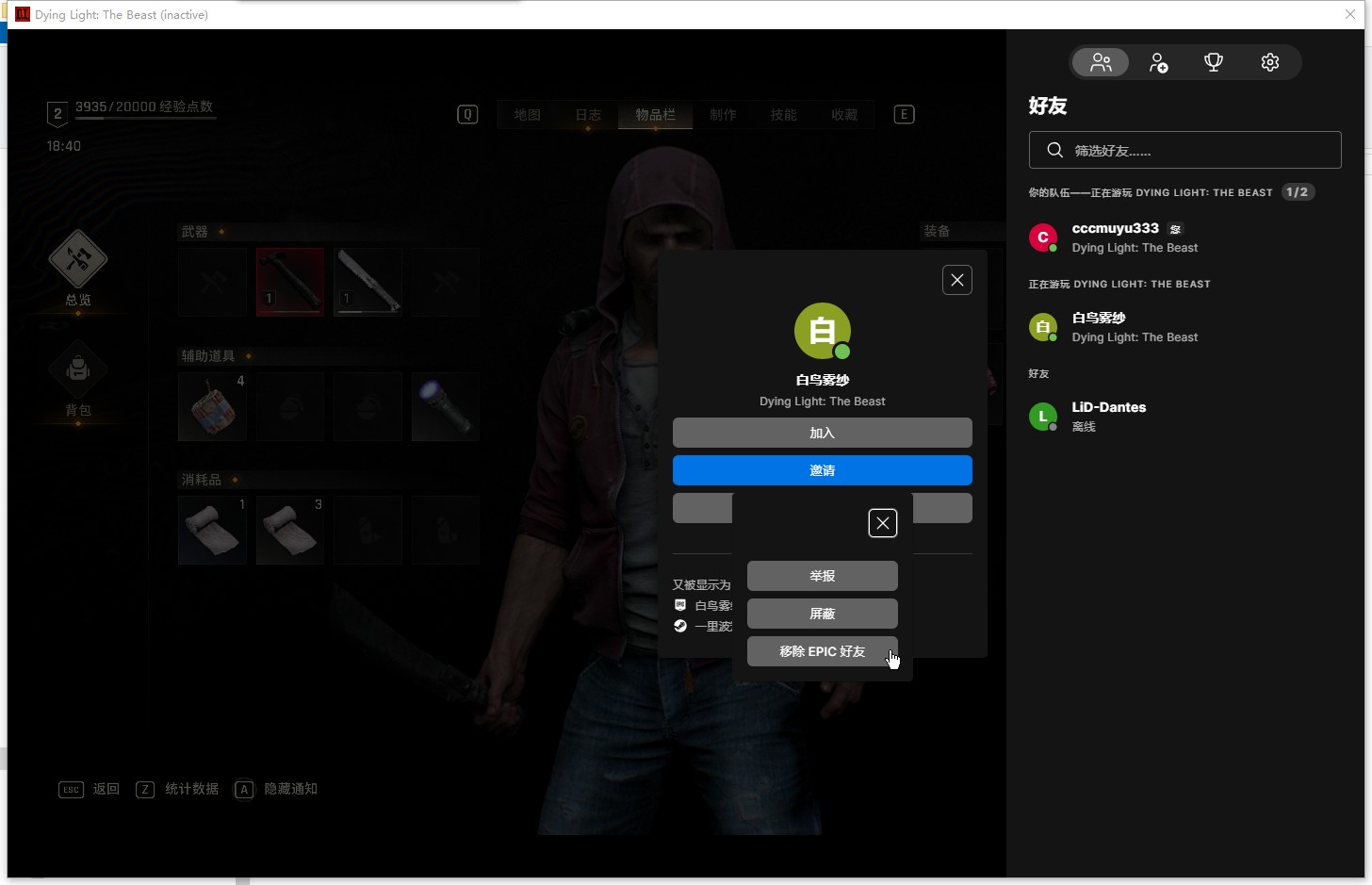 注意:游戏中同时按Shift+F3键,呼出epic列表,里面可以相互加EPIC好友或者删除好友。加了好友之后才能在好友列表找到他。游戏中按Shift+F3键呼不出epic列表的话,可以在epic官网或者epic客户端相互加好友。