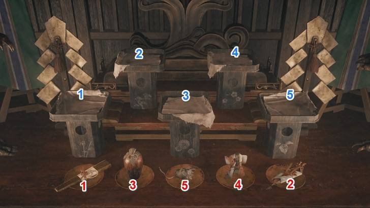 需要将5件贡品按照正确顺序放在祭坛底座上,每个底座都有一个绳结图案,可以按△键检查。