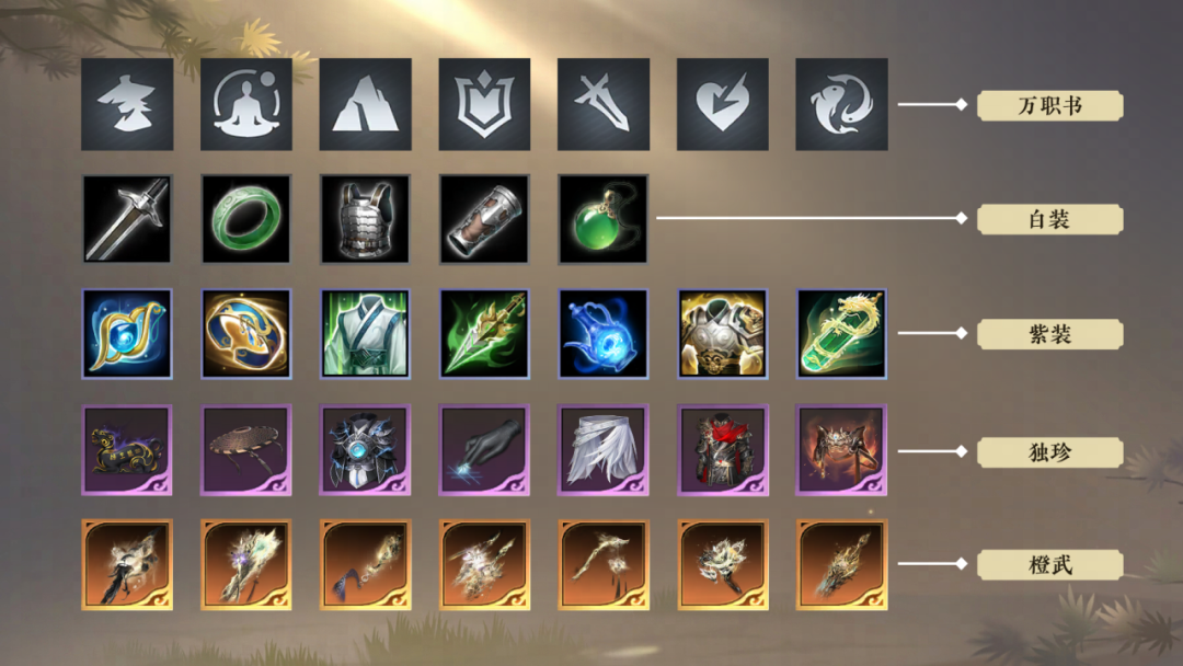 ③装备的品质:分为白装、紫装、独珍、橙武,品质依次升高,对应属性也越强。此外还有万职书,装备万职书的棋子可以获得对应的羁绊。