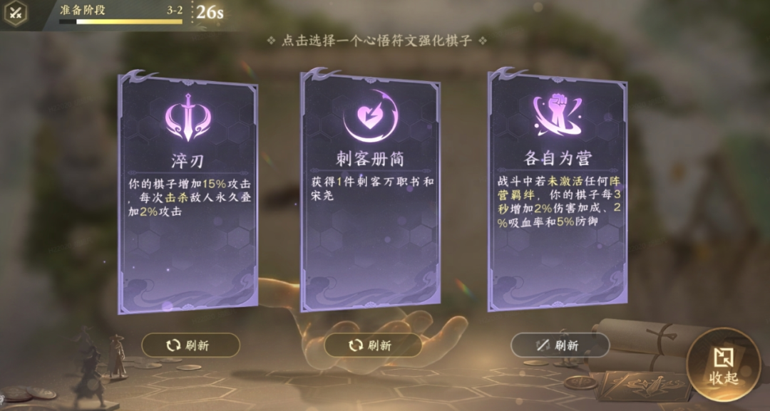 在2-1、3-2、4-2阶段玩家需要选择心悟,分为经济类(帮助获得更多金币)和战力类(直接提升棋子战力),需要权衡进行选择~(如果不满意,每个心悟可以点一次刷新进行更换)