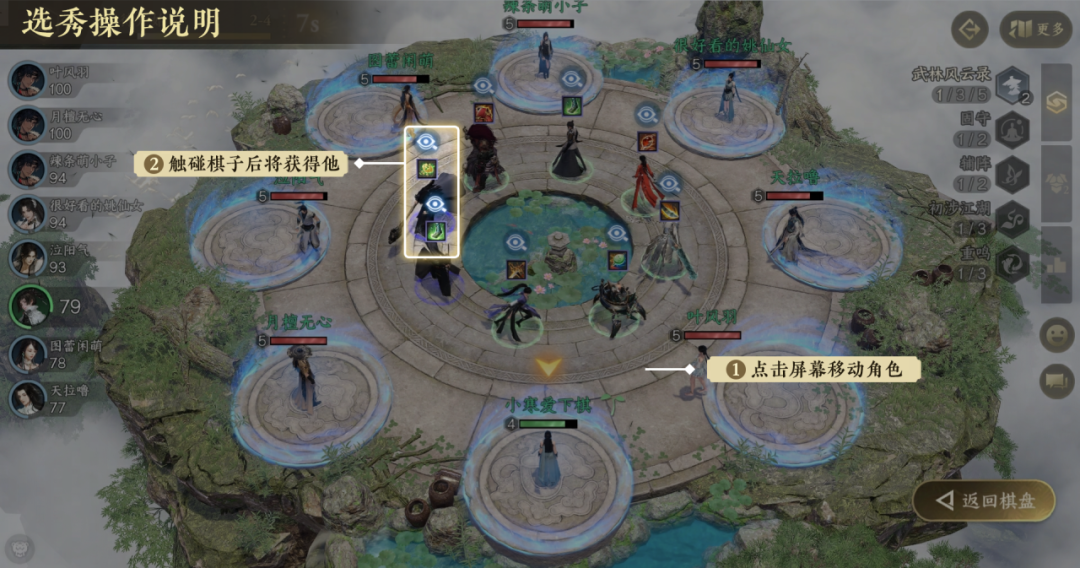 选秀环节时,玩家依次上前选择自己想要的棋子。血量越低越先操作。点击屏幕移动角色,触碰到棋子后可以获得该棋子。