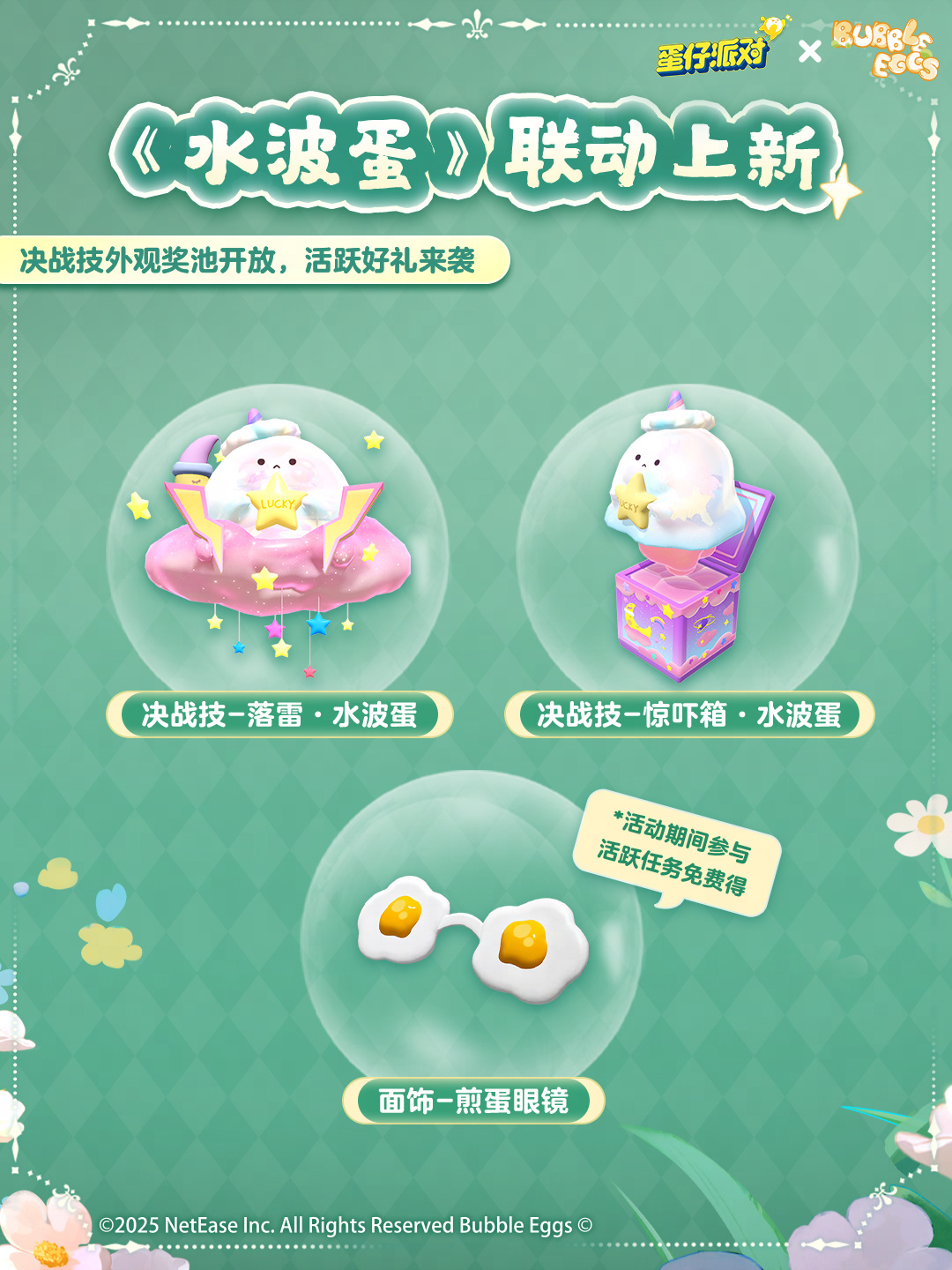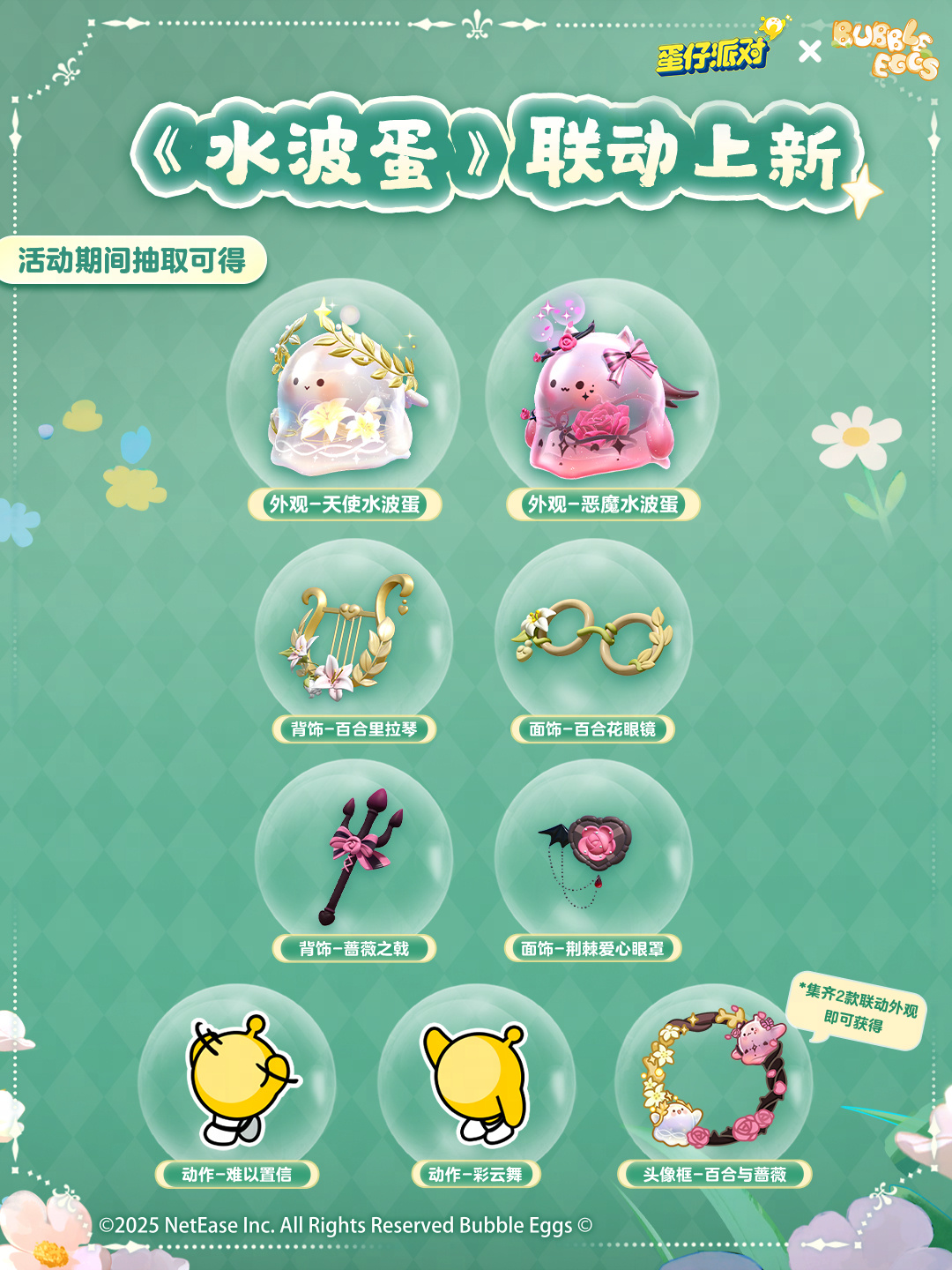 拥有外观<水波蛋>或<晴天水波蛋>中任意一只的蛋仔,在首次获得<天使水波蛋>或<恶魔水波蛋>中任意一只后,即刻获得10枚许愿币返利。