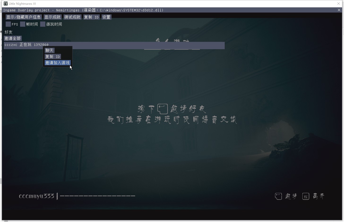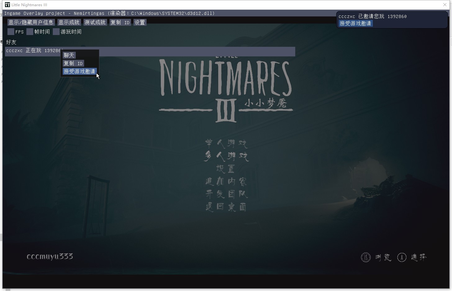 加主机:游戏右上角看到邀请信息——同时按Tab+Shift键呼出联机窗口——找到好友,右键——接受游戏邀请——等主机选择章节——按Enter准备。