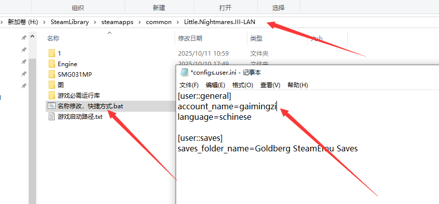 小小梦魇3改名字记事本方式打开“名称修改,快捷方式.bat”,找到account_name = "gaimingzi",把gaimingzi改成自己想要的名字。