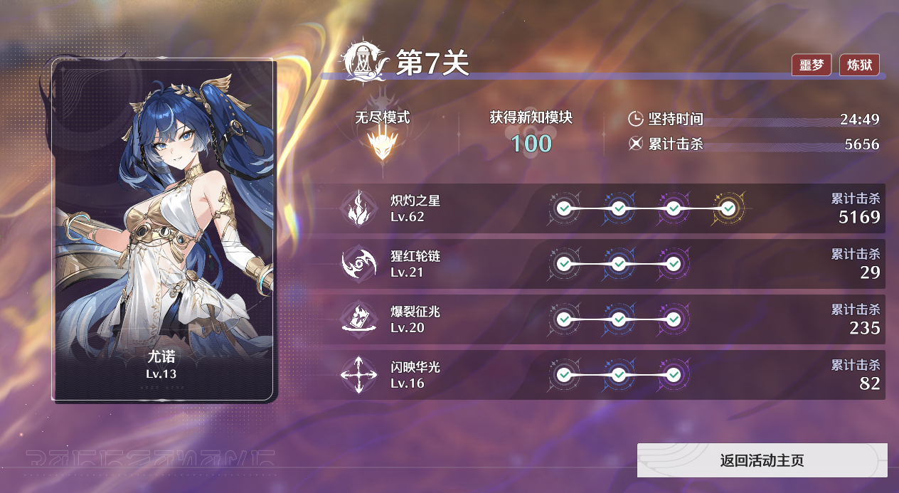 前六关难度较低,只要使用推荐共鸣者并在第七波时选择助力主武器进化的武装即可稳定通关。真正的挑战在于第七关的无尽模式,核心目标是在持续刷怪中保持输出与生存平衡。