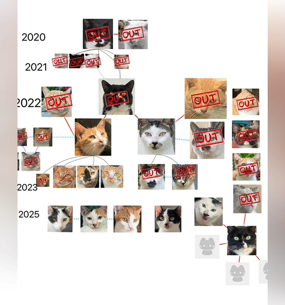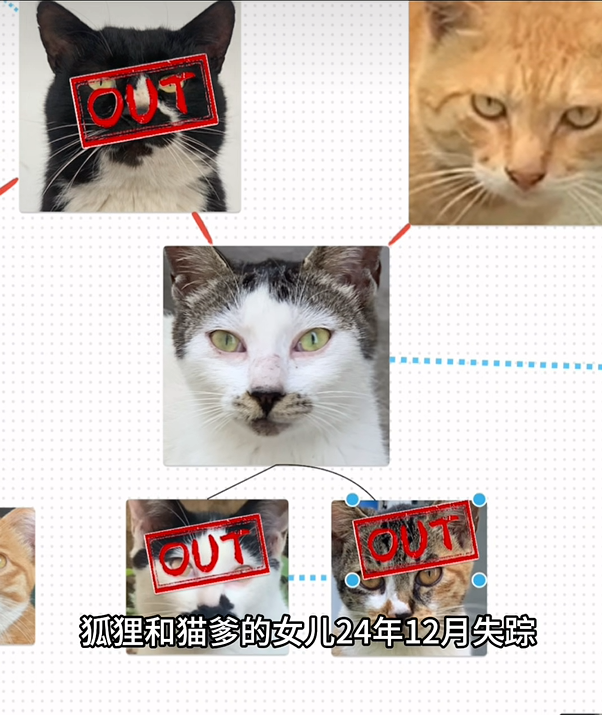 最后就是2025年1月耄耋也失踪,至此耄耋家族所有成员宣布失踪,并且宣告绝嗣。而白手套家族,除了疑似莲莲的那只小猫,也没有成员存活。最可惜的是大黄家族,目前只有他的老婆与儿子还在世,但因为耄耋下了黑手的缘故,小黄失去了生育能力,大黄绝嗣也是早晚的事。