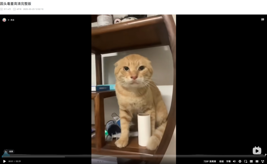 而它在互联网上的爆火则是那段长达3分29秒,在博古架上对着人类疯狂哈气以及摆出一副攻击性“圆头”的视频。我们之前写过它的内容,详细可见“圆头耄耋你没死啊?!这只网红猫传来噩耗,为啥网友不同情?”