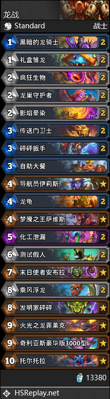 炉石传说最近的卡组十分丰富,那么大家知道在本周有什么强力的上分卡组呢?下面为大家带来的炉石传说标准龙战卡组内容,感兴趣的玩家们千万不要错过哦!