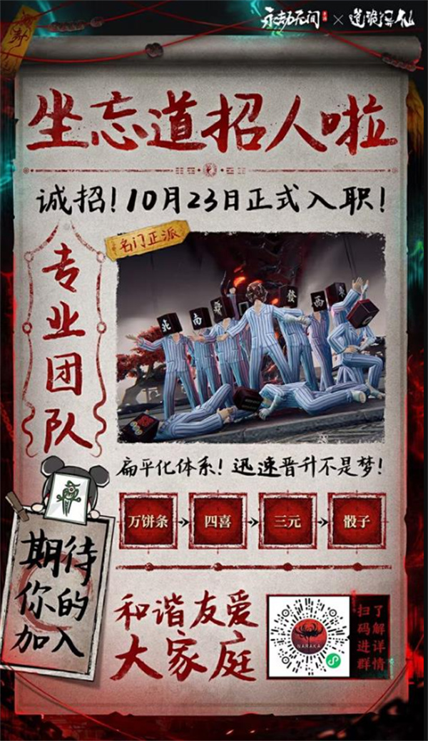 在这次联动中,玩家将有机会加入“坐忘道”,体验一套独特的晋升体系。晋升路线以麻将牌型为灵感设计,从“万、饼、条”基础位阶出发,逐步突破“四喜”“三元”等境界,最终向组织最高位“骰子老大”发起冲击。