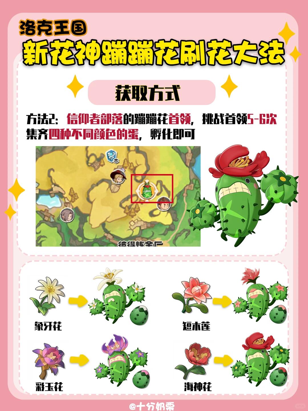 信仰者部落蹦蹦花首领挑战首领 5-6 次,集齐象牙花、短木莲、彩玉花、海神花4 种不同颜色的蛋,孵化就能直接获得对应形态的蹦蹦花,再也不用蹲点位刷了!