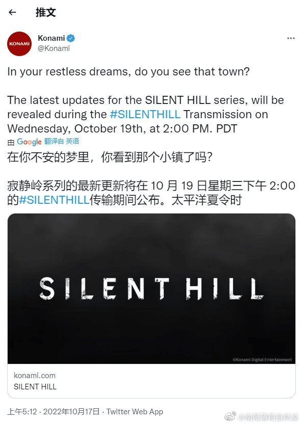 Konami官推确认他们将在本周的数字活动上分享《寂静岭》系列最新情报,具体时间为北京时间10月20日(周四)早晨5点。