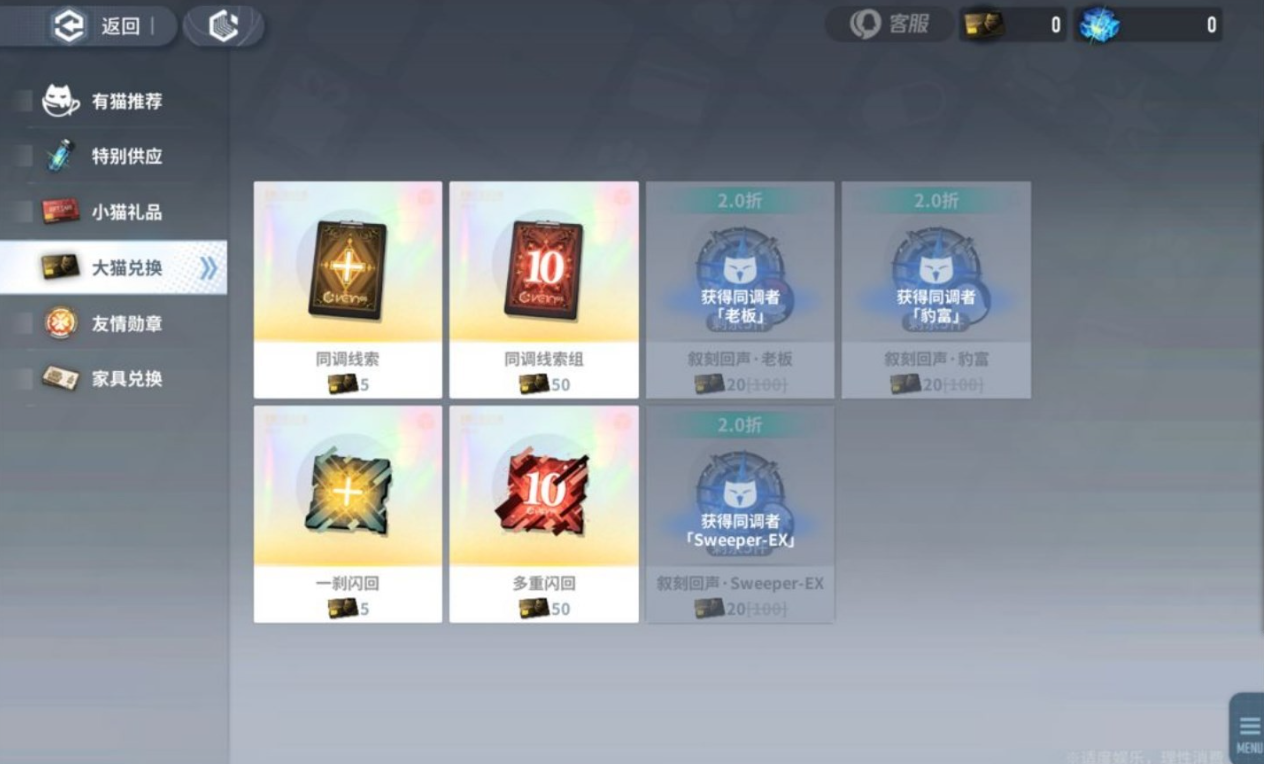 “同调线索”、“一刹闪回”这类的抽卡道具,大家看情况兑换,微氪党或者是小氪党可以先把大猫兑换卡攒着,等到后面活动推出了老板、豹富这些同调者,看看自己是不是需要再考虑兑换卡怎么用。