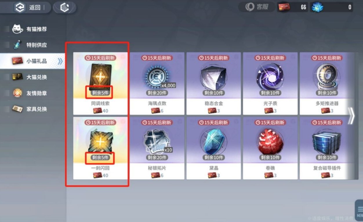 小猫礼品中的道具需要我们消耗“小猫礼品卡”来进行兑换。优先注意小猫礼品中的“同调线索”以及“一刹闪回”,两种道具是限时限量出售,尽可能在限时时间内把这两种道具全部换完,然后再考虑其他道具。