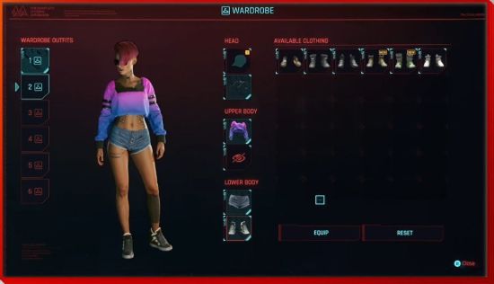 衣柜能让玩家在不改变护甲属性的情况下更改穿搭的外观。可以前往 V 的任何一所公寓和安全屋,和房间里的衣柜交互,使用已经拥有的服装创建最多 6 套穿搭,然后在物品栏面板中进行切换。