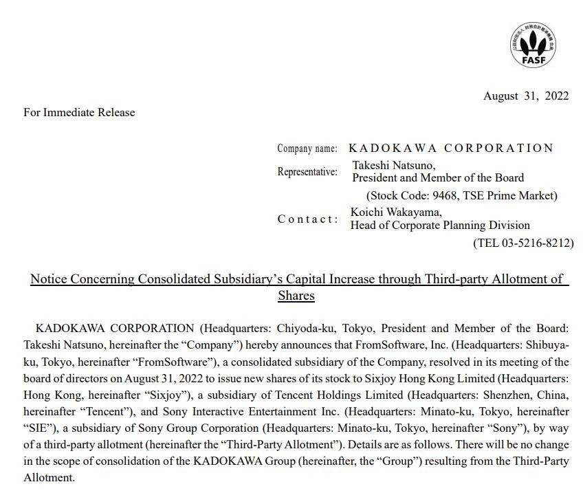 今日,角川集团宣布,旗下公司Fromsoftware(FS社)将向腾讯旗下公司Sixjoy香港有限公司以及索尼互娱进行配股。即:这两家公司将共计收购FS社30%的股份,其中腾讯Sixjoy占比为16.3%,SIE占比为14.1%。