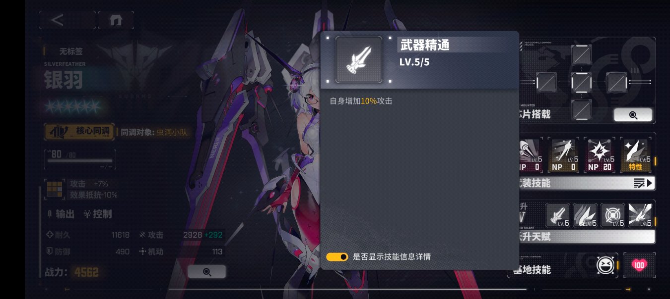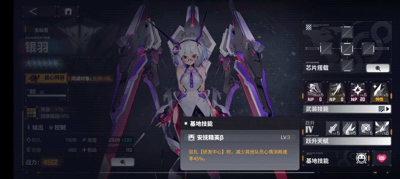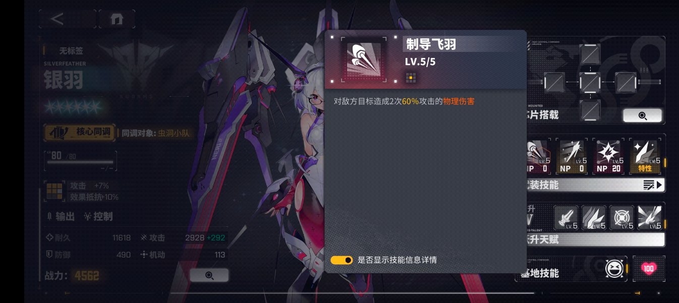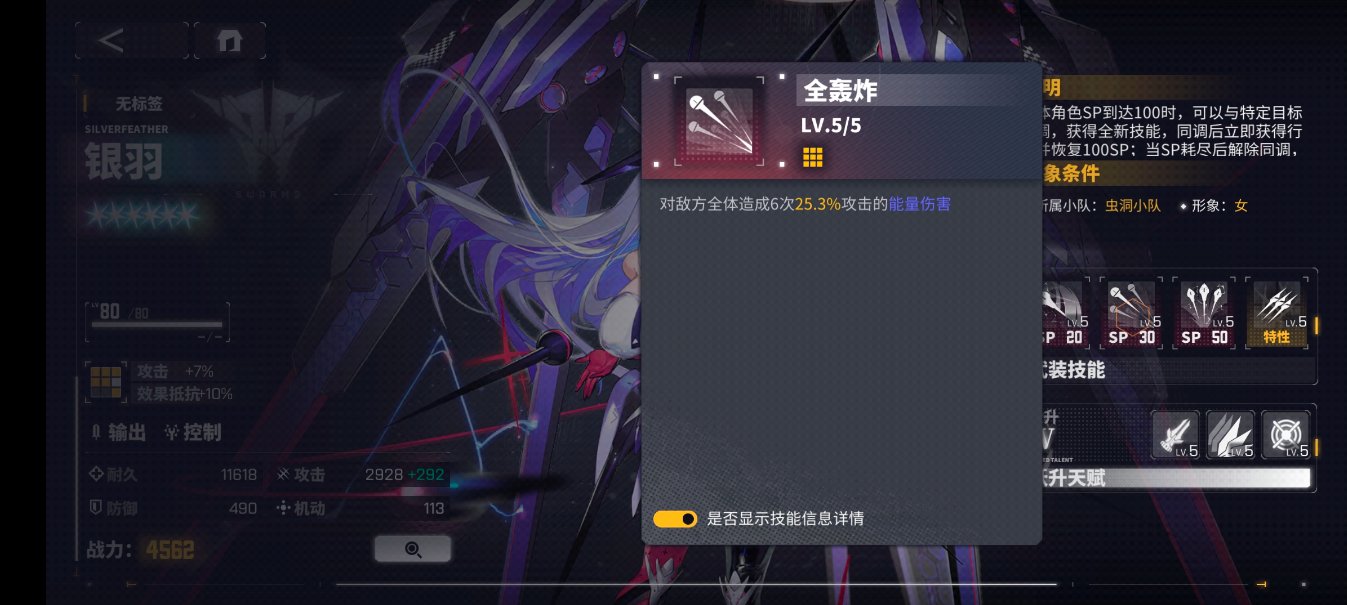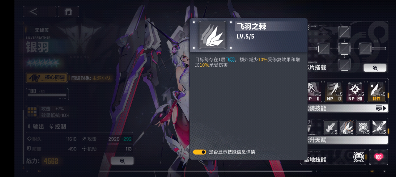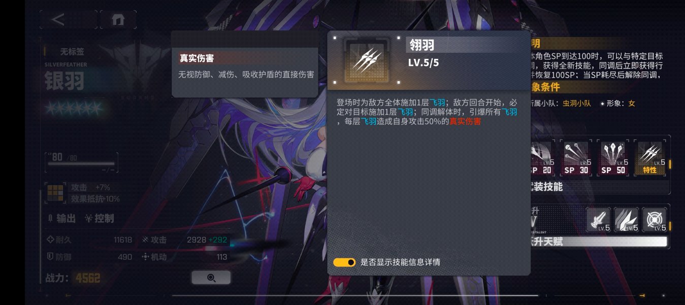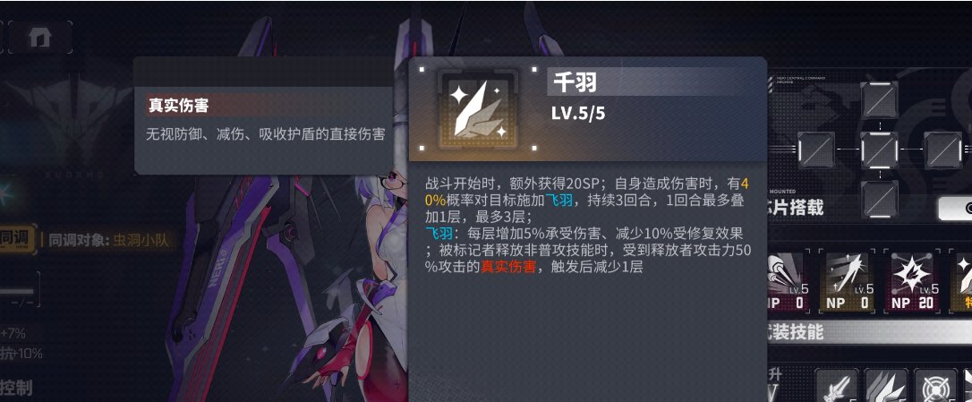 战斗开始时,额外获得20SP;自身造成伤害时,有20%概率对目标施加飞羽,持续3回合,1回合最多叠加1层,最多3层;