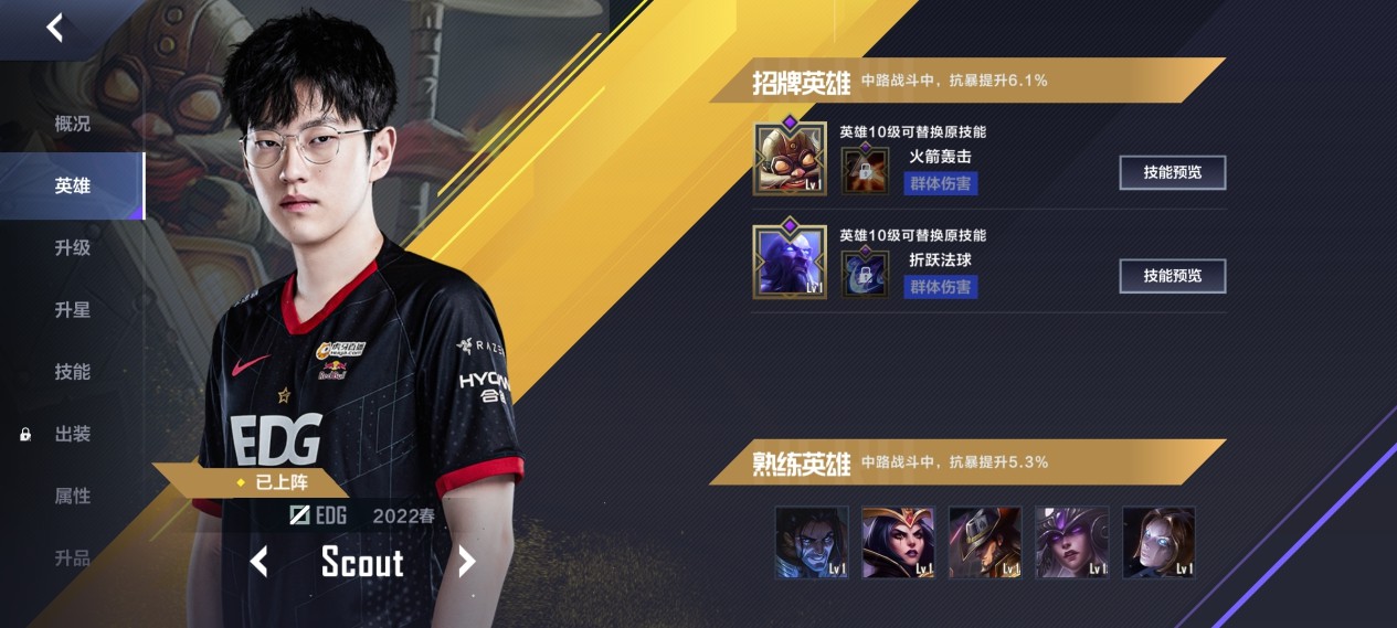 相比于“出道即巅峰”式的选手体验,本作更强调玩家对选手的逐步培养的过程。花费一些资源,打通从比赛心态、英雄池深度、赛场经验的各个关节,那些LPL知名选手就能随着成长,转变为赛场上的六边形战士。一些顶格选手更是有着自己的绝活英雄,当熟练度足够高后,他们在操刀这些“名场面英雄”时,就会爆发出相当强力的效果。
