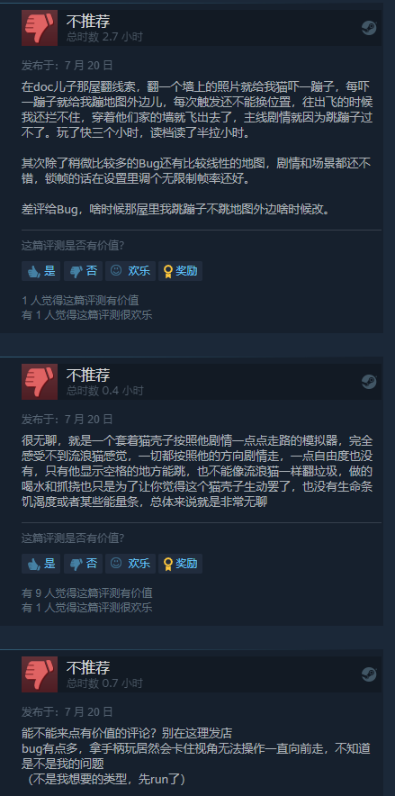 差评玩家则普遍围绕游戏本身的素质给出了差评,不少差评玩家反馈称游戏有不少Bug,交互少、内容也不够充足。