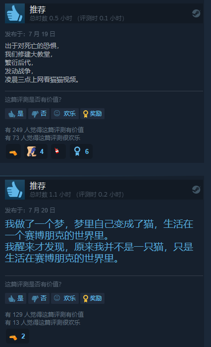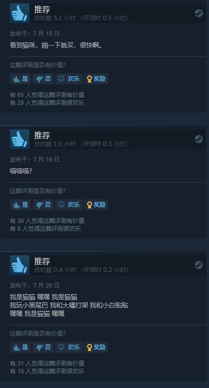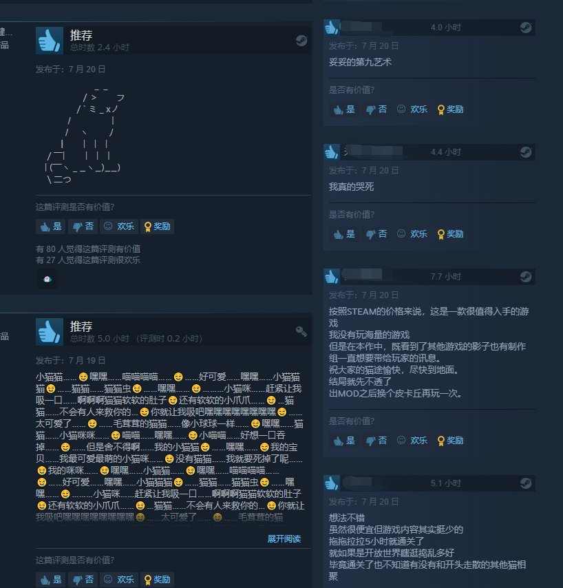 好评玩家普遍为游戏中猫咪们的出色模型以及演出所折服,引得不少“铲屎官”们狂喜。