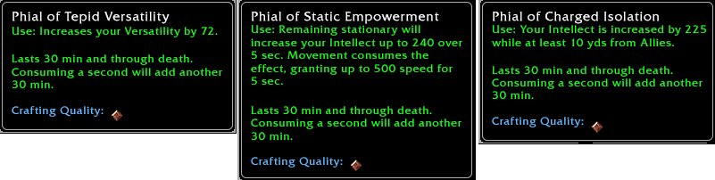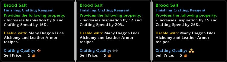 对许多游戏前期的低阶配方(例:升级用装备、新手药水等)来说,在玩家刚学会的时候,整体制作技能可能太低,因此制作最低素质的成品反而更符合效益。其实这些配方的难度并不高,只要玩家的专业技能够高,或是在某些路线的专精足以提升你的整体技能,要以最高素质制作这些配方就会变得相当容易,即使是用低素质的材料也没问题。