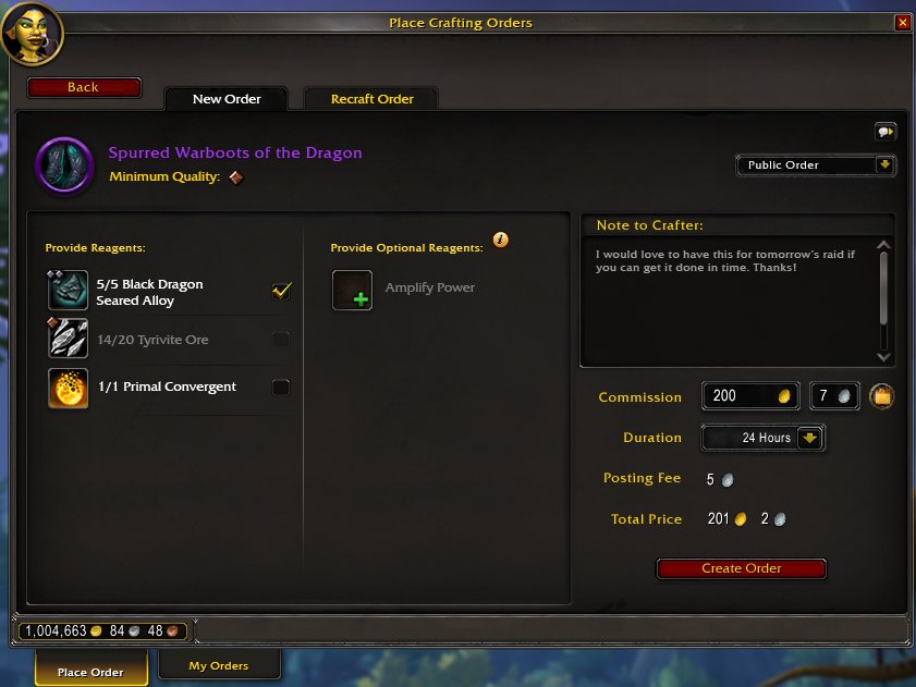 在确认下订单前,玩家可以指定要哪些人来完成订单。你可以选择不设限,也就是对所有人开放,也可以限定只有工会成员或是特定个人才能完成该订单。你和制作人都可以提供可交易的材料,不过特殊材料必须由其中一人单独提供。在订单内容包含灵魂绑定物品的情况下,灵魂绑定材料通常必须由下订单的玩家自行提供。