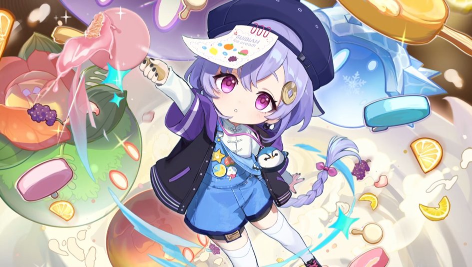 在旅行者和派蒙都难以抵挡的炎热夏日里,七七想到了用史莱姆制作冰淇淋的「解暑秘方」。圆圆的可爱外形与层次丰富的口感,让旅行者与派蒙恢复了活力,也定能如同七七所想,冰冰的想和你分享,给你带来好心情。