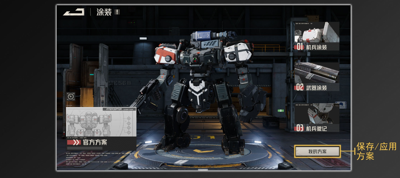 在搭配好涂装并应用后,可以在“我的方案”种进行保存,方便其他机兵套用搭配好的涂装。