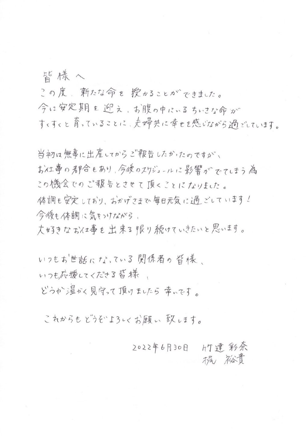 日本知名声优竹达彩奈在今天(6月30日)宣布怀孕消息,表示目前处于安定期。同为声优的丈夫梶裕贵也公开了这一喜讯,两人将一起期待这个新生命。