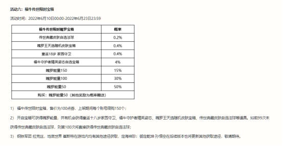 而6月10号还有另一个宝箱上线:福牛传世限时宝箱。开启后有机会获得重返十八岁家园守卫、福牛守护者精英姿态、魄罗王天选随机皮肤宝箱、传世典藏皮肤自选法球等道具。如前99次未获得传世典藏皮肤自选法球,则第100次将直接获得传世典藏皮肤自选法球。