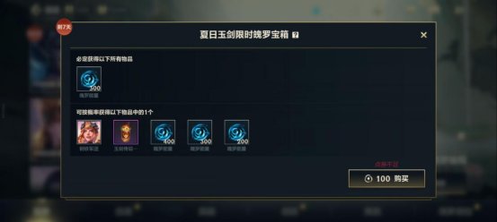 商城内还上架了夏日玉剑限时魄罗宝箱,开启后有概率获得玉剑传说随机皮肤宝箱。魄罗宝箱,每开启10次将必得玉剑传说随机皮肤宝箱或钢铁军团拉克丝皮肤,总体而言性价比不错。