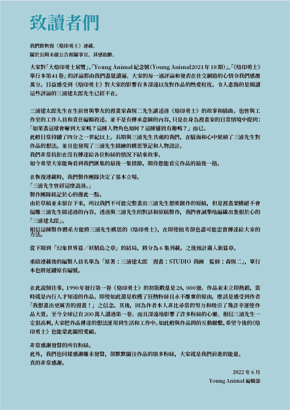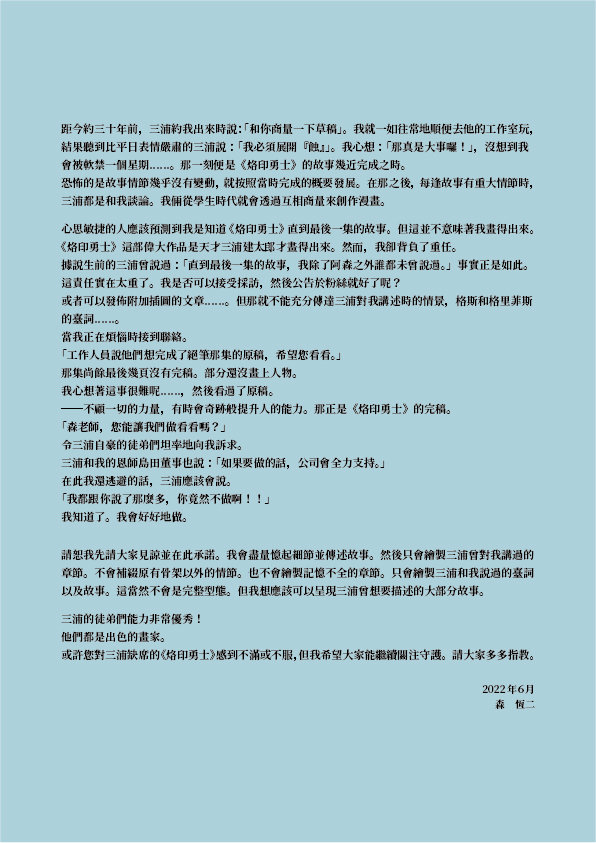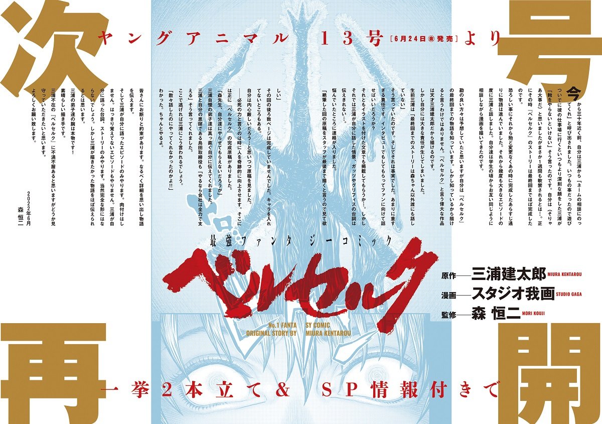 森恒二向读者承诺,连载只会绘制三浦建太郎生前口述过的情节、台词和故事,不会增添原有骨架外的内容。