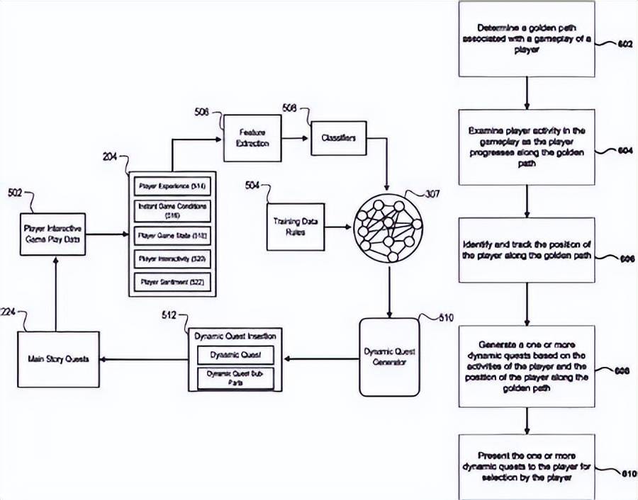 从公开的专利示意图可以看出,为提供给玩家最满意的游戏体验,索尼所申请的专利将根据玩家所探索的游戏剧情占比和难度自动生成好下一个需要完成的支线任务。