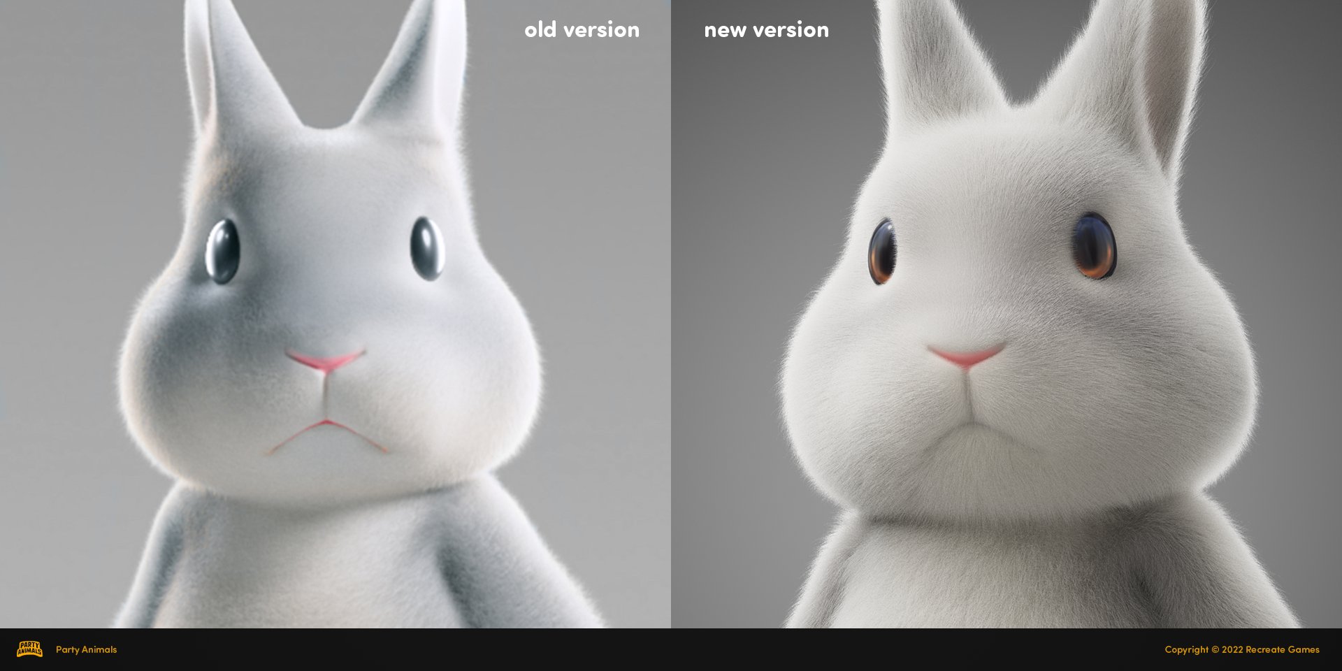 之前由于时间限制,设计师没有太多的时间投⼊到精细的头像制作中。现在我们将每个⻆⾊头像都完全重新制作了⼀次,⼤部分的时间是花在⽑发上,其⽬标是让⽑发质感更像⼩动物,⽽不是⽑绒玩具。下⾯是 Nemo 和 Carrrot 的之前和现在的对⽐。