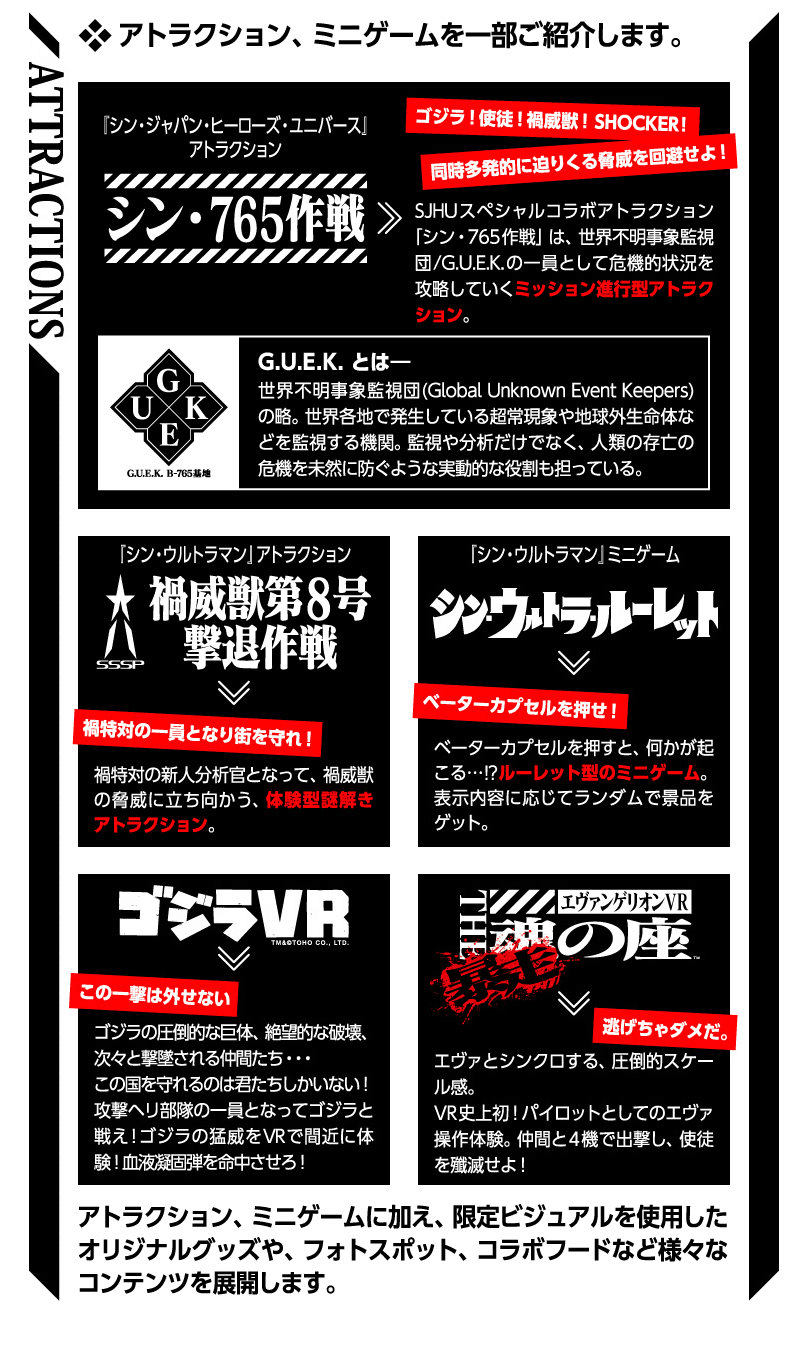 由《新·哥斯拉》×《新·假面骑士》×《新·EVA剧场版》×《新·奥特曼》四部作品组成的联动企划 #SJHU# 将于 年内 举办体验型活动“Shin Japan Heroes Amusement World”。玩家将面对同时来袭的哥斯拉、修卡、使徒和祸威兽,通过体感VR等方式参与活动,解决各处的危机。