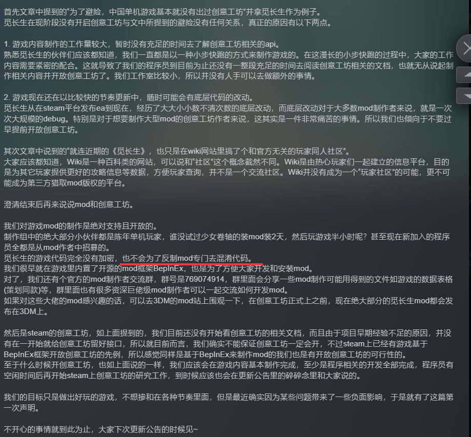 《觅长生》官方近日在节奏之下直接就发文打脸,他们之所以没开创意工坊,跟所谓的“避险”丝毫无关,只是因为工作量大、早期经验不足,他们没时间去了解创意工坊的API,也没有在一开始就为创意工坊留下接口,而且游戏目前数不清的底层改动,对于Mod开发来说也并非最好时机,他们故不倾向于过早地开放创意工坊,虽然也没法保证以后就一定能开起来,但等到游戏开发基本完成有空闲后,会开始Steam创意工坊的研究。而那个被点到的“Wiki玩家社区”,也仅仅是一个方便玩家查询的信息平台,跟“鬼谷”的第三方Mod平台完全无法类比。哎呀这一条条的逐个回应,还来了句“不会为了反制Mod故意去混淆代码”,心都扎穿了啊“鬼谷”!