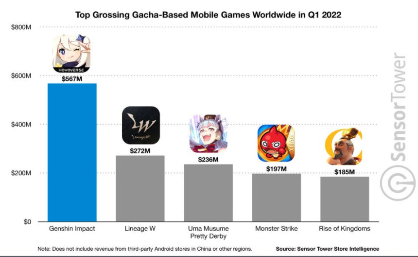《原神》同时也是2022年第一季度中排名第一的抽卡类游戏,高于《天堂W》《赛马娘》等手游。