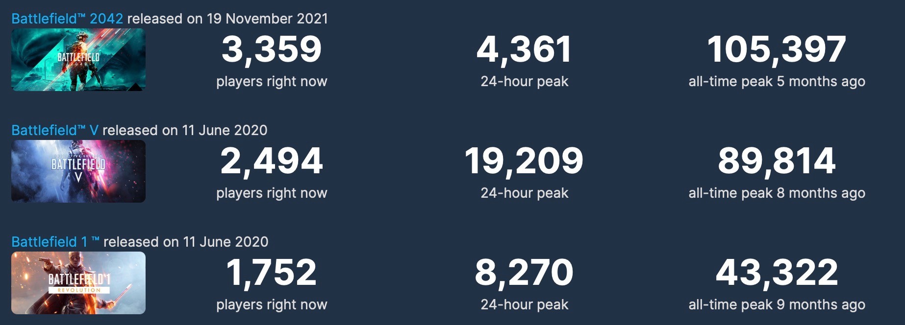 而从当前玩家在线数来看,《战地2042》是最多的,截至发稿为3359人。相比之下,《战地5》为2494人,《战地1》为1752人。