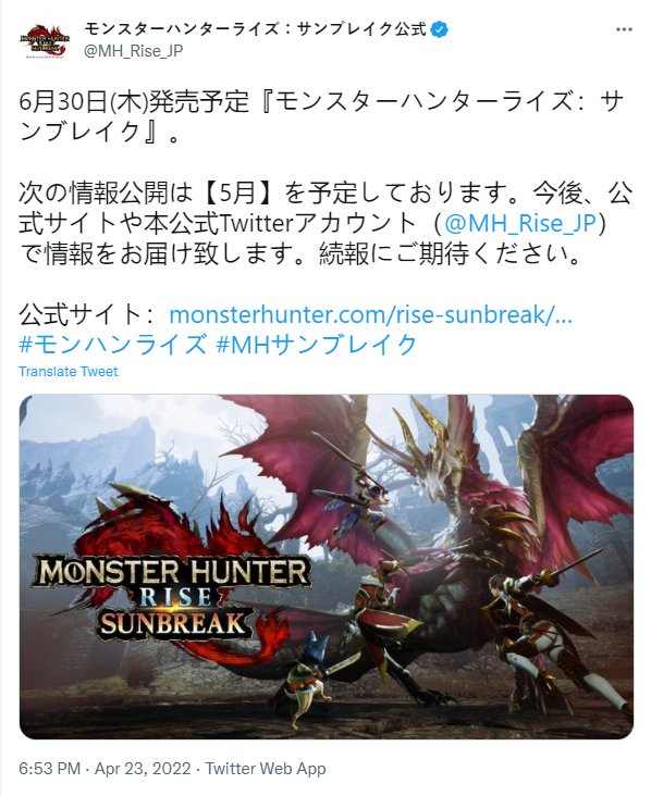 今天,《怪物猎人崛起:曙光》官方发推宣布,新情报将于5月释出,玩家可关注官方网站了解并预定该作。