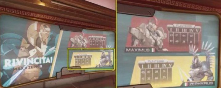 现在在斗兽场地图中的一个酒吧屏幕上的计分板上,显示他将与另一位名叫“Maximus”的角斗士进行最后对决,Zephyrus穿着罗马角斗士式的盔甲,并手持双剑,是一位近战英雄,从国旗来看,他来自意大利。