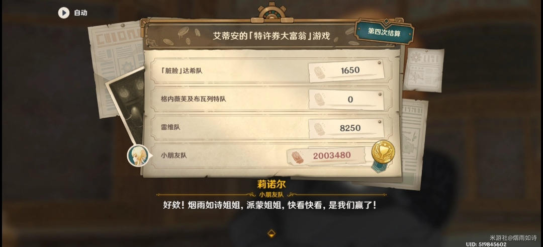 对话结束后,我们回去与莉诺尔等人对话,得知第三次结算的情况