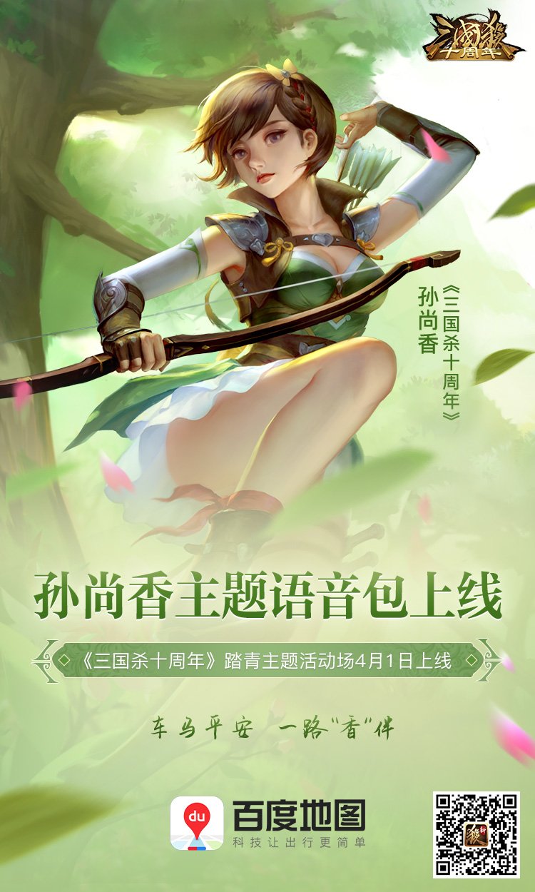 “策”马“香”伴,与君同行。3月25日,《三国杀十周年》与百度地图联动,正式上线了三国杀首款导航语音包,游戏中的人气角色孙策、孙尚香,将打破次元壁,与各位玩家一起结伴出行。